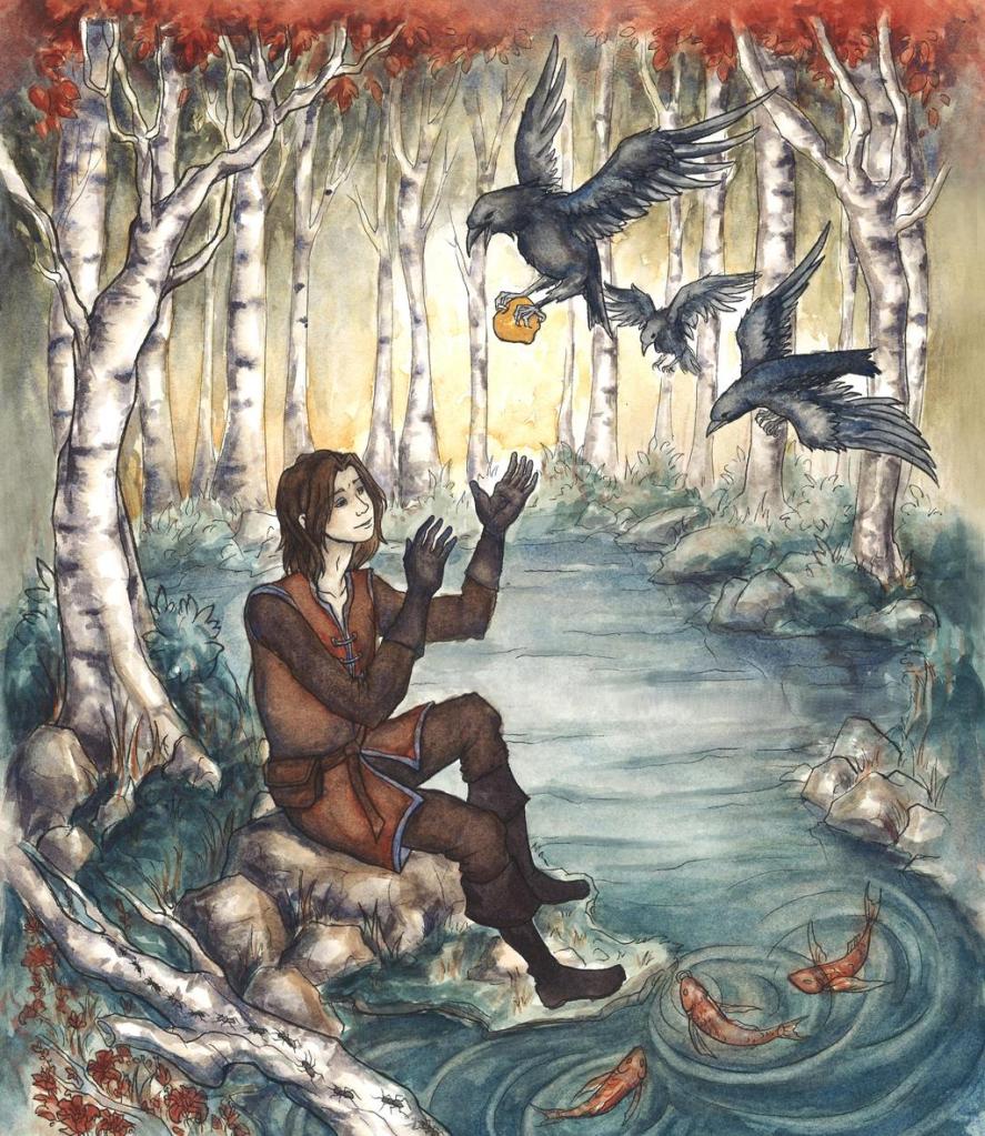 Proseguì e giunse in un bosco; là due corvi, padre e madre, gettavano i loro piccoli fuori dal nido e dicevano: «Siete grandi a sufficienza per mantenervi da soli, noi non possiamo più sfamarvi».